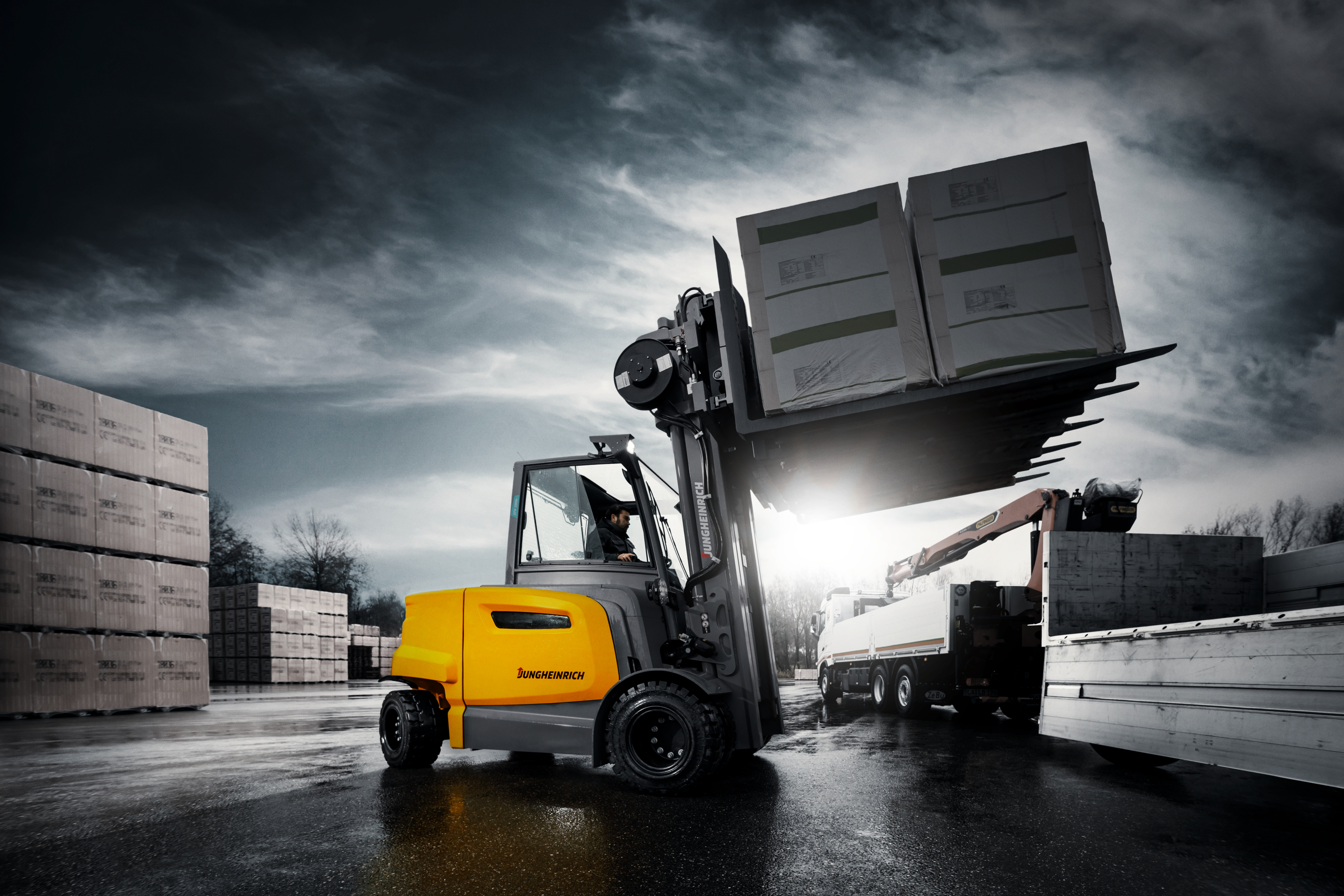 The EFG 6 Series is especially designed for powerful performance applications in beverage and building material wholesaling or in mechanical engineering. With a load capacity of up to 9 tonnes and a load centre of 900 mm, Jungheinrich will now be offering one of the most powerful electric forklift trucks in the intralogistics market. The EFG 6 Series is available with both superior lithium-ion technology and proven lead-acid battery technology. Thanks to the sophisticated drive concept with two asynchronous drive motors and two synchronous reluctance lift motors, the EFG Series 6 delivers maximum power at minimum consumption.